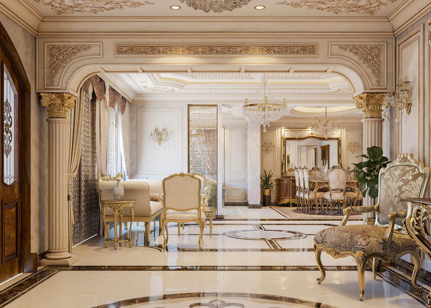 Những hệ trụ cột, nội thất bằng chất liệu đá tự nhiên, gỗ cùng với đó là sắc màu nhẹ nhàng như màu trắng, màu be điểm thêm màu vàng quyền quý là những gì người nhìn dễ dàng nhận ra trong phong cách thiết kế nội thất này.