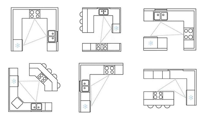 Khoảnh cách tủ lạnh – bếp, bếp – bồn rửa, tủ lạnh – bồn rửa không quá 65cm. Các nội thất liên quan của từng khu vực phải nối liền và thông với nhau đảm bảo sự linh hoạt và gắn kết. Thông thường tủ bếp được đặt vị trí hình tam giác nhằm thuận tiện cho việc sử dụng của gia chủ.