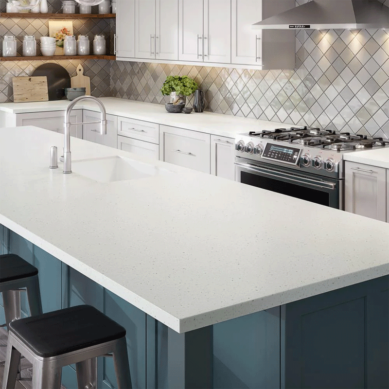 Ở khu vực vách ngăn giữa của 2 tủ bếp trên và dưới bạn nên ưu tiên chất liệu kính hoặc đá để dễ vệ sinh mà sang trọng. Trong khi đó những mặt tủ bếp có thể ốp  đá marble, đá granite, đá vicostone.. vừa đảm bảo an toàn, sang vừa dễ dàng vệ sinh. Tùy thuộc vào ngân sách gia đình để chọn chất liệu phù hợp.