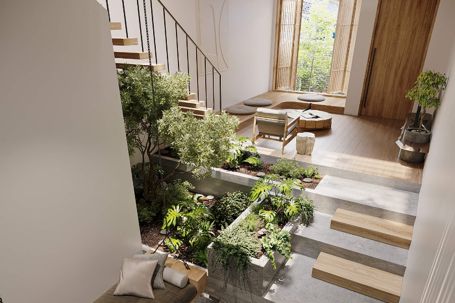Thêm sự tươi mát cho cầu thang cũng như “làm đẹp” cho ngôi nhà, mang đến bầu không khí trong lành đó chính là trang trí, bố trí những cây xanh ở khu vực gầm cầu thang. Việc thiết kế không gian xanh sẽ tối ưu diện tích hiệu quả mang đến sự sống động, xinh tươi cho nhà bạn.