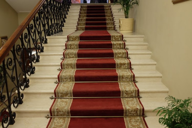 Để thêm màu sắc cho bậc thang, cách đơn giản là sử dụng những tấm thảm sàn dưới các bậc thang. Thảm có thể được chọn theo gam màu chủ đạo của không gian nhà bạn hoặc là một điểm nhấn màu sắc độc đáo. Tùy thuộc vào kiến trúc, phong cách thiết kế ngôi nhà để chọn màu sắc cũng như họa tiết khu vực cầu thang cho phù hợp.