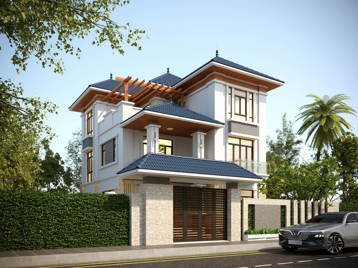 Biệt thự 3 tầng thiết kế mái Nhật với độ dốc vừa phải giúp quá trình thoát nước nhanh chóng vừa đảm bảo sự mát mẻ bên trong ngôi nhà. Màu sắc của mái cũng hài hòa với toàn bộ kiến trúc tạo nét thẩm mỹ cao.Nhìn từ trên cao xuống có thể thấy biệt thự 3 tầng chừa một khoảng trống xung quanh tạo làm tiểu cảnh sân vườn, và một khoảng sân thượng trên tầng 3 cung cấp chỗ thư giãn, nghỉ ngơi lý tưởng cho các thành viên trong gia đình.
