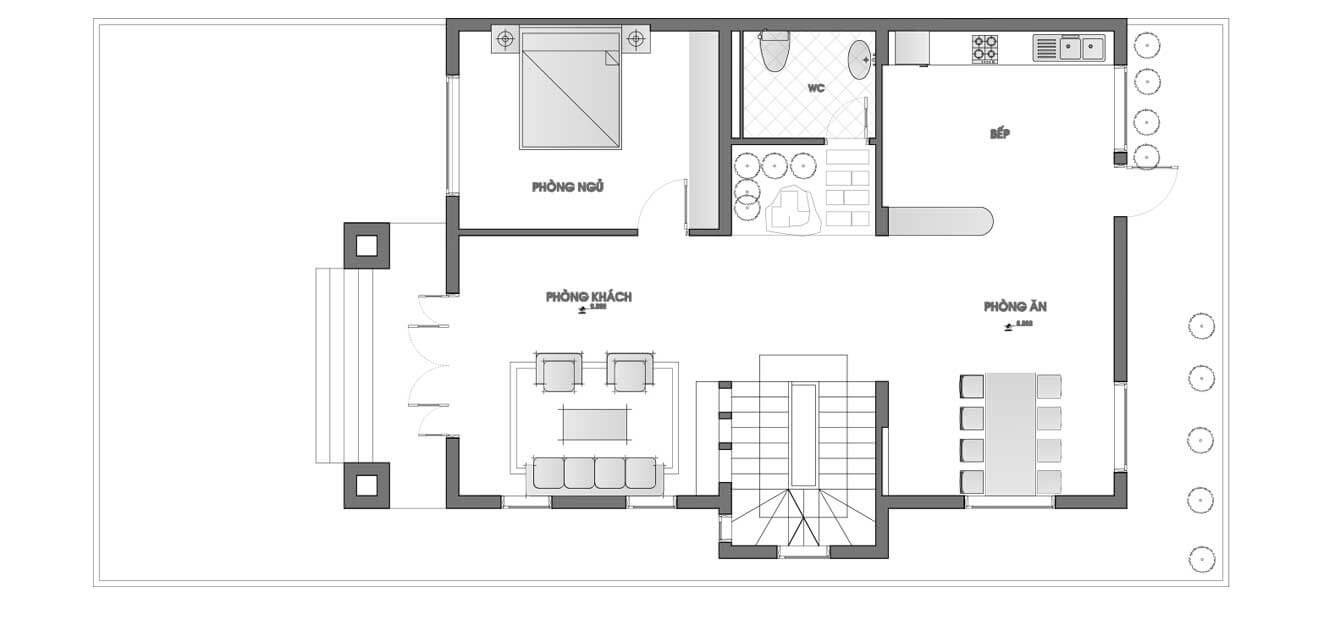 Tầng trệt gồm: Phòng khách, phòng ăn, phòng ngủ, bếp, WC