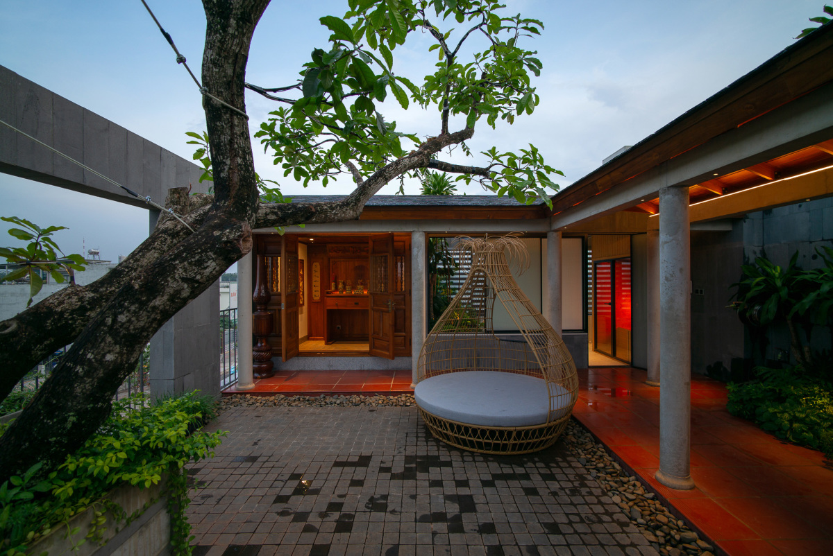 Biệt thự 3 tầng không gian mở thiết kế hông gian thờ cúng và thư giãn của gia đình ở trên cùng. Phòng thờ được thiết kế theo phong cách truyền thống với hệ cột, cửa gỗ và mái ngói.