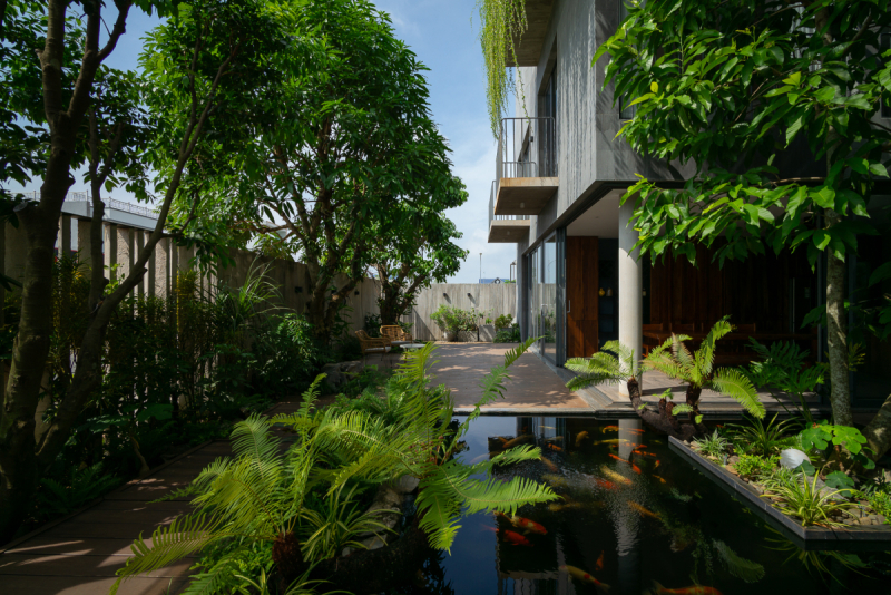 Bước vào bên trong, với khoảng sân vườn được trồng nhiều cây xanh với nhiều tầng lớp khác nhau tạo bóng mát, bên cạnh hồ cá koi.. tạo nên một phong cảnh đẹp vừa điều hòa không khí mát lành.