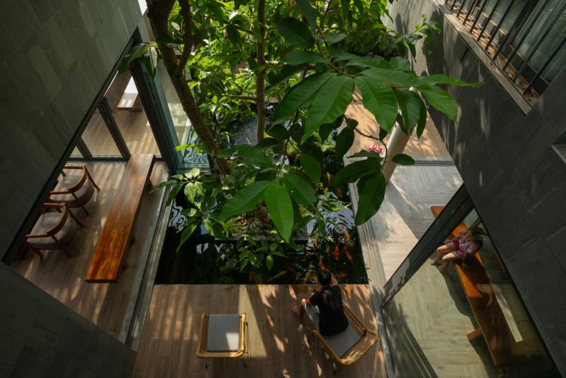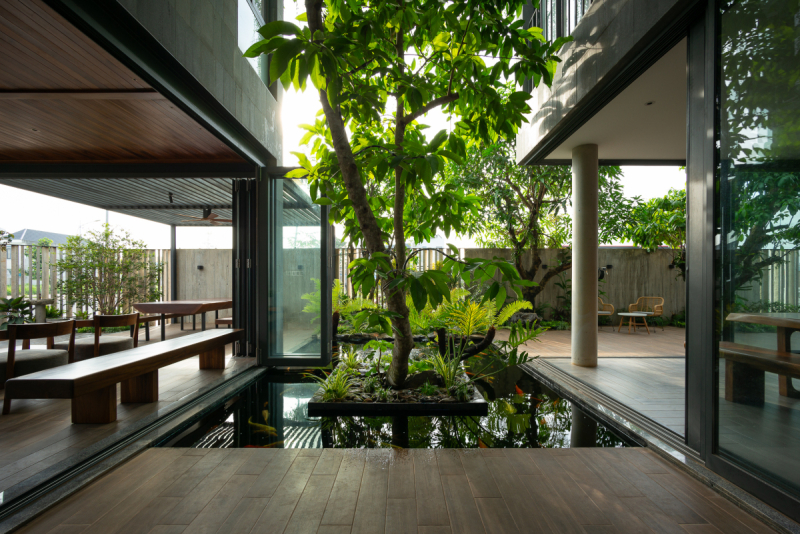 Biệt thự không gian mở được thiết kế liên kết, hồ cá coi và cây xanh được đặt ở giữa để từ bất kỳ vị trí nào cũng có thể ngắm nhìn được.