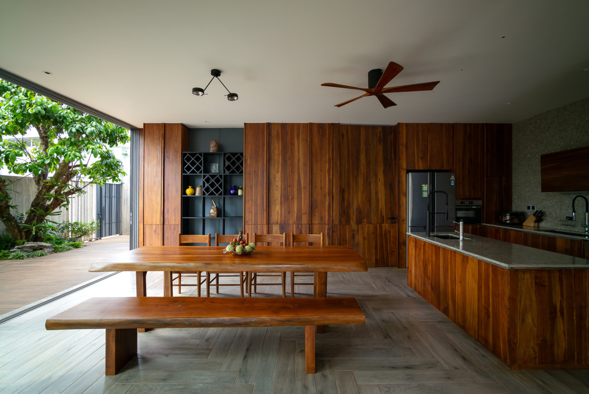 Khu vực bếp và phòng ăn cũng được thiết kế mở và sử dụng chất liệu nội thất gỗ tự nhiên. Khu vực bếp và nơi ăn uống được liền mạch ra thiên nhiên bên ngoài và nội thất được tối ưu, sắc màu gỗ ấm áp mà không hề cảm giác bị tối.