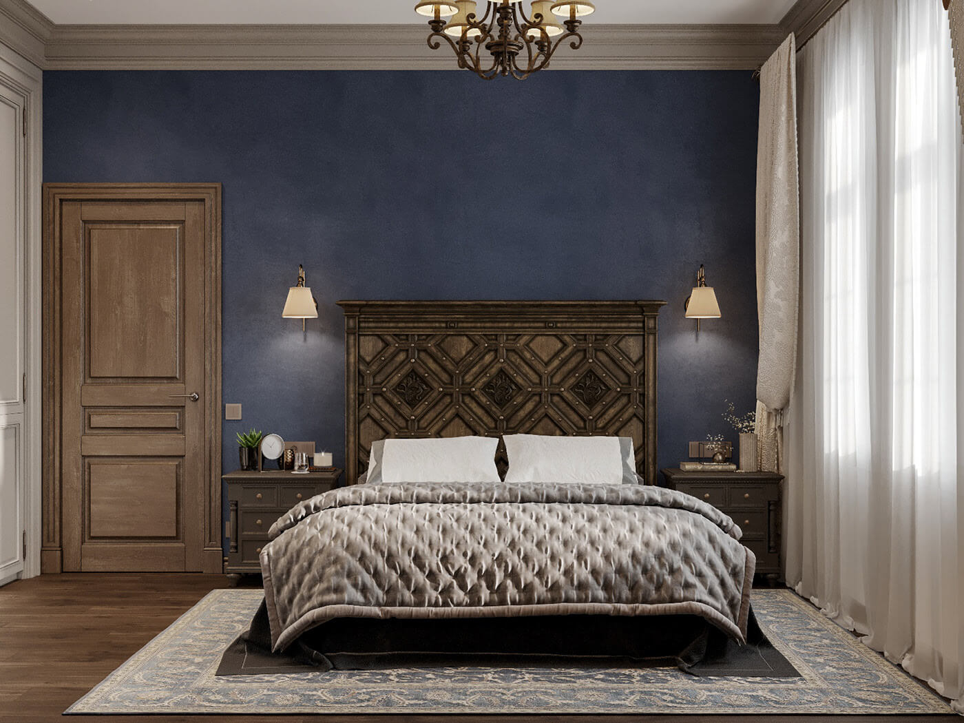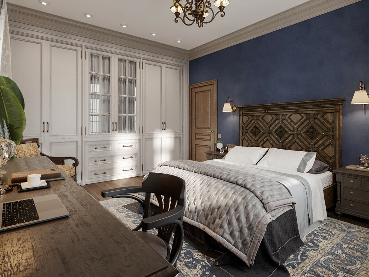 Nếu như phòng ngủ trước chúng ta thấy được sự lãng mạn, nữ tính thì ở phòng ngủ này người nhìn cảm nhận được sự sang trọng có phần nam tính. Vẫn là phong cách tân cổ điển song việc sử dụng màu sắc, nội thất khác biệt đã mang đến một vẻ đẹp riêng biệt phù hợp với sở thích của chủ nhân trong căn phòng.