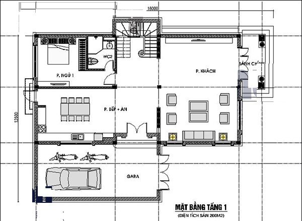 Mặt bằng tầng trệt gồm: Gara, phòng khách, bếp + phòng ăn, phòng ngủ + WC