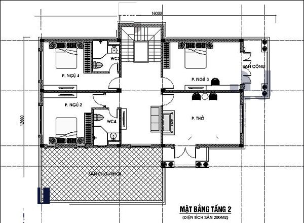 Mặt bằng tầng 2 gồm: 3 Phòng ngủ, 1 phòng thờ, 2 WC, sân thượng