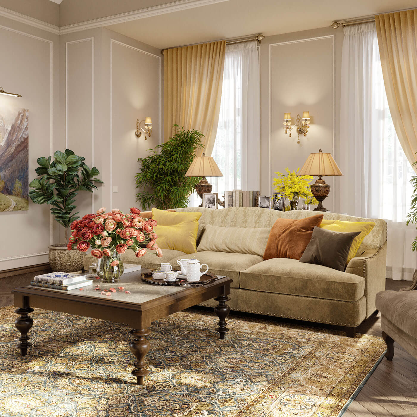 Đầu tiên từ phòng khách có thể thấy những màu trắng xám nhẹ nhàng  trên tường được điểm tô thêm những đường chỉ đậm chất tân cổ điển cùng với đó là những màu vàng nhẹ nhàng của rèm cửa.