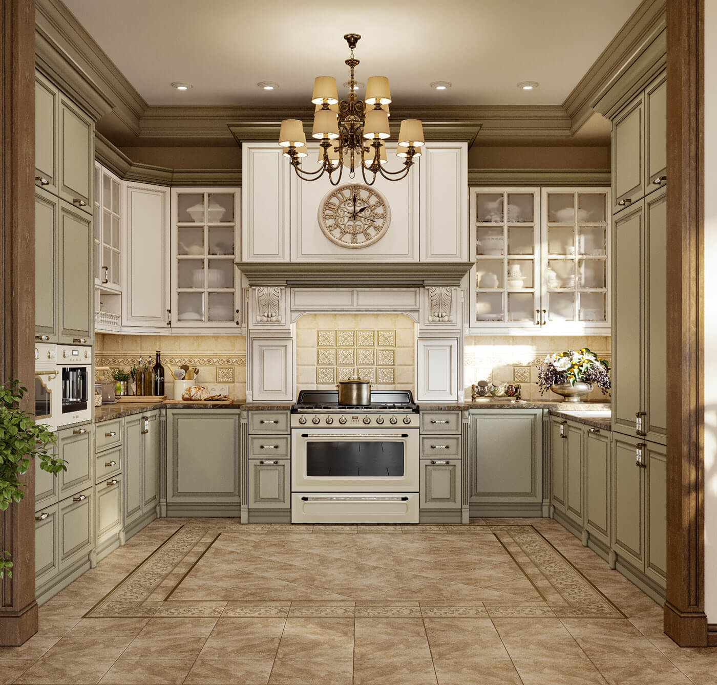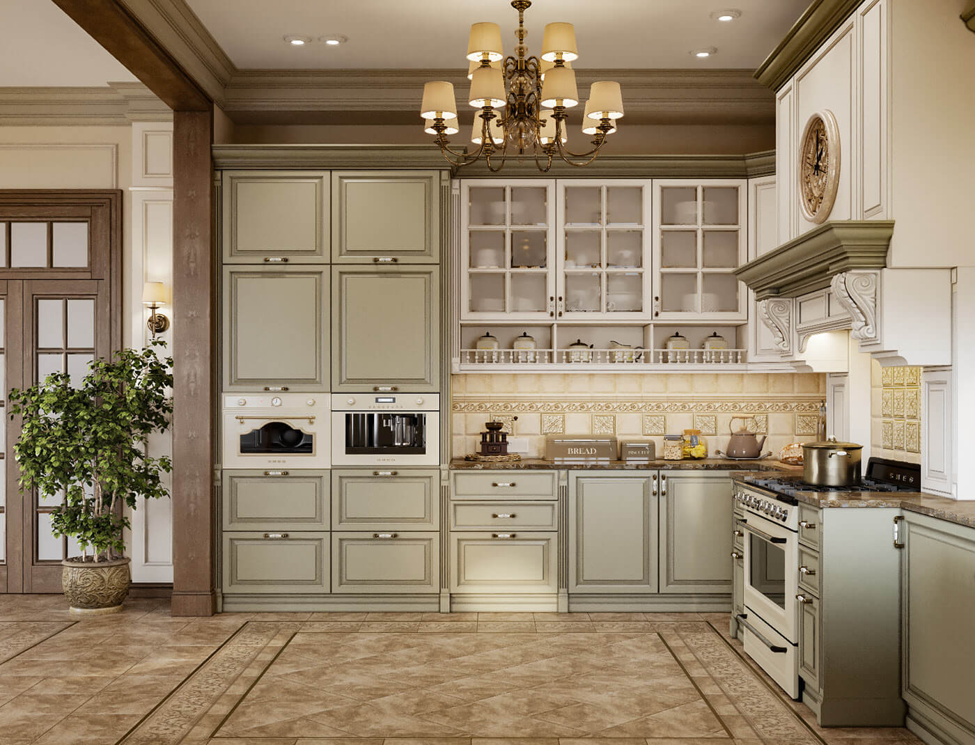 Và không gian bếp cũng được thiết kế nội thất, sử dụng màu sắc hài hòa với phòng khách. Tủ bếp được làm bằng gỗ tự nhiên sơn màu xanh nhẹ nhàng và những đường chỉ được thiết kế vừa đủ để tạo điểm nhấn vừa dễ lau chùi.