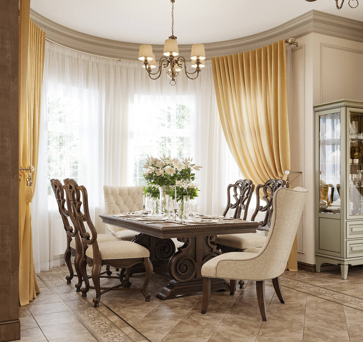 Bộ bàn ghế ăn bằng gỗ tự nhiên được thiết kế đường cong tinh tế cùng chạm khắc hoa văn đậm chất nghệ thuật, phần nệm và lưng ghế được bọc nệm mang đến cảm giác êm ái, thoải mái cho người sử dụng.