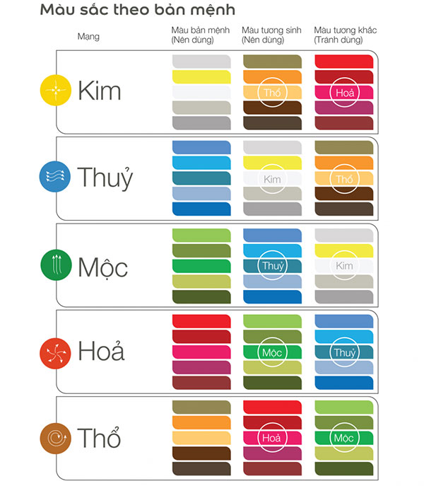 Bởi theo Ngũ Hành thì mỗi mệnh đều có những màu sắc phù hợp nhằm mang lại may mắn, thịnh vượng cho gia chủ (gọi là màu tương sinh) và màu không hợp gọi là (màu tương khắc)… những màu này thường mang lại những điều không may mắn.