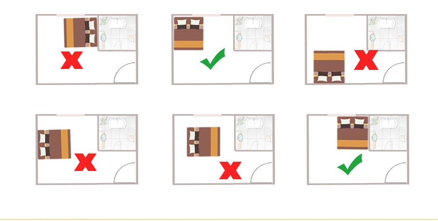 Không nên bố trí giường ngủ đối diện với nhà vệ sinh, vì nhà vệ sinh là nơi dùng đại tiện bài trừ các chất thải của cơ thể ra ngoài, chất mộc không sạch.