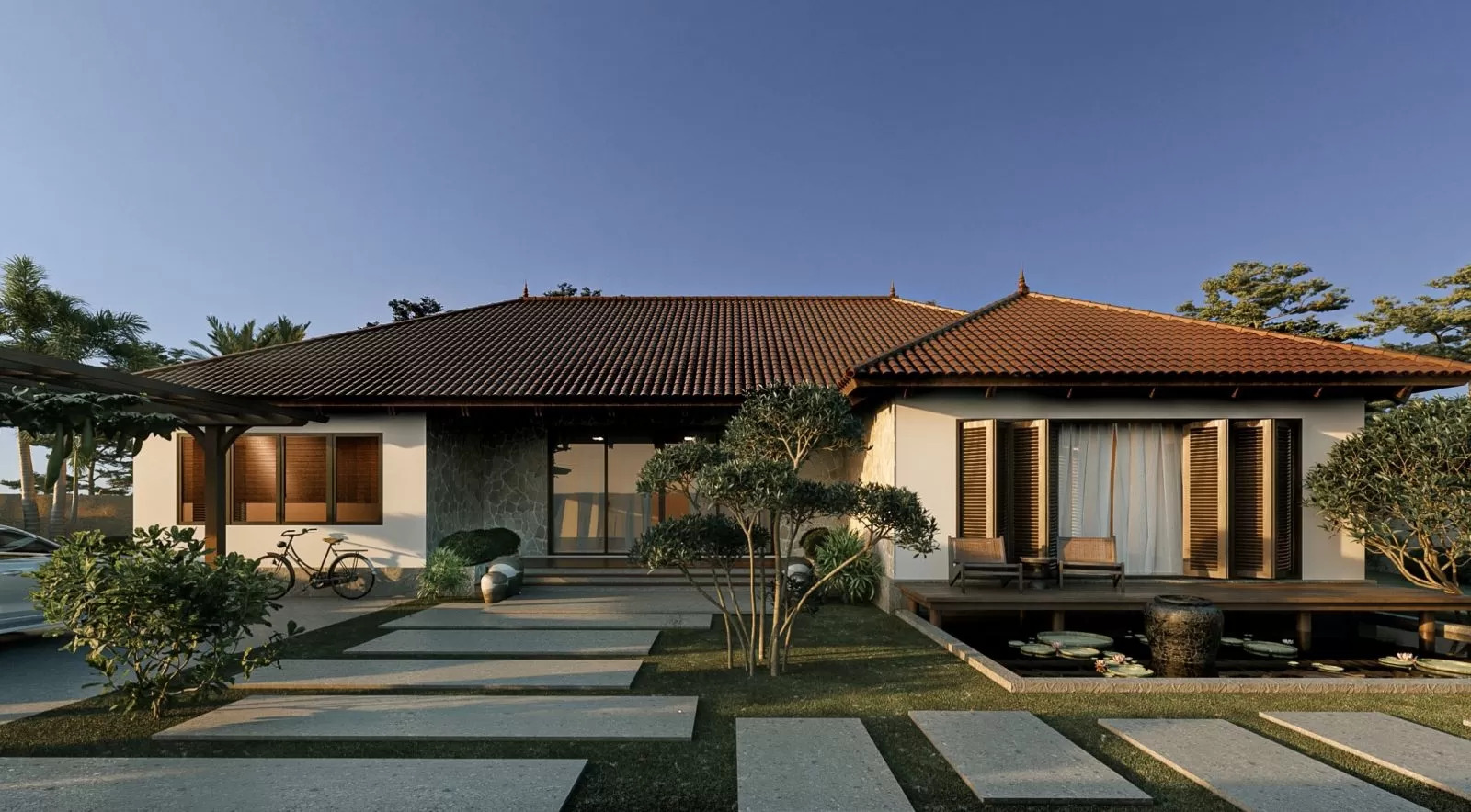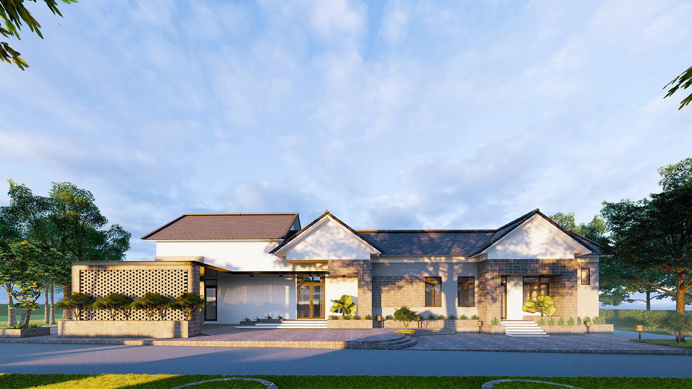 Biệt thự 1 tầng 5 phòng ngủ hiện đại gắn liền với sân vườn thoáng đãng, vẻ đẹp hiện đại với phần mái thái thanh thoát đặc biệt được thiết kế như một resort nghỉ dưỡng khi mỗi căn phòng đều hướng ra sân vườn và đảm bảo sự riêng tư. Việc sử dụng sơn tường, thiết kế màu trầm tối cảm nhận được sự ấm áp và phần mái với những đường bo tròn tạo điểm nhấn tinh tế.