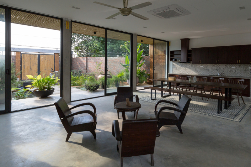 Khu vực bếp và phòng ăn được bố trí ở gần cửa bên hông để giúp cho việc quá trình lưu thông không khí được tốt hơn, hạn chế được tiếng ồn khi nấu nướng mà phòng khách đang có khách.