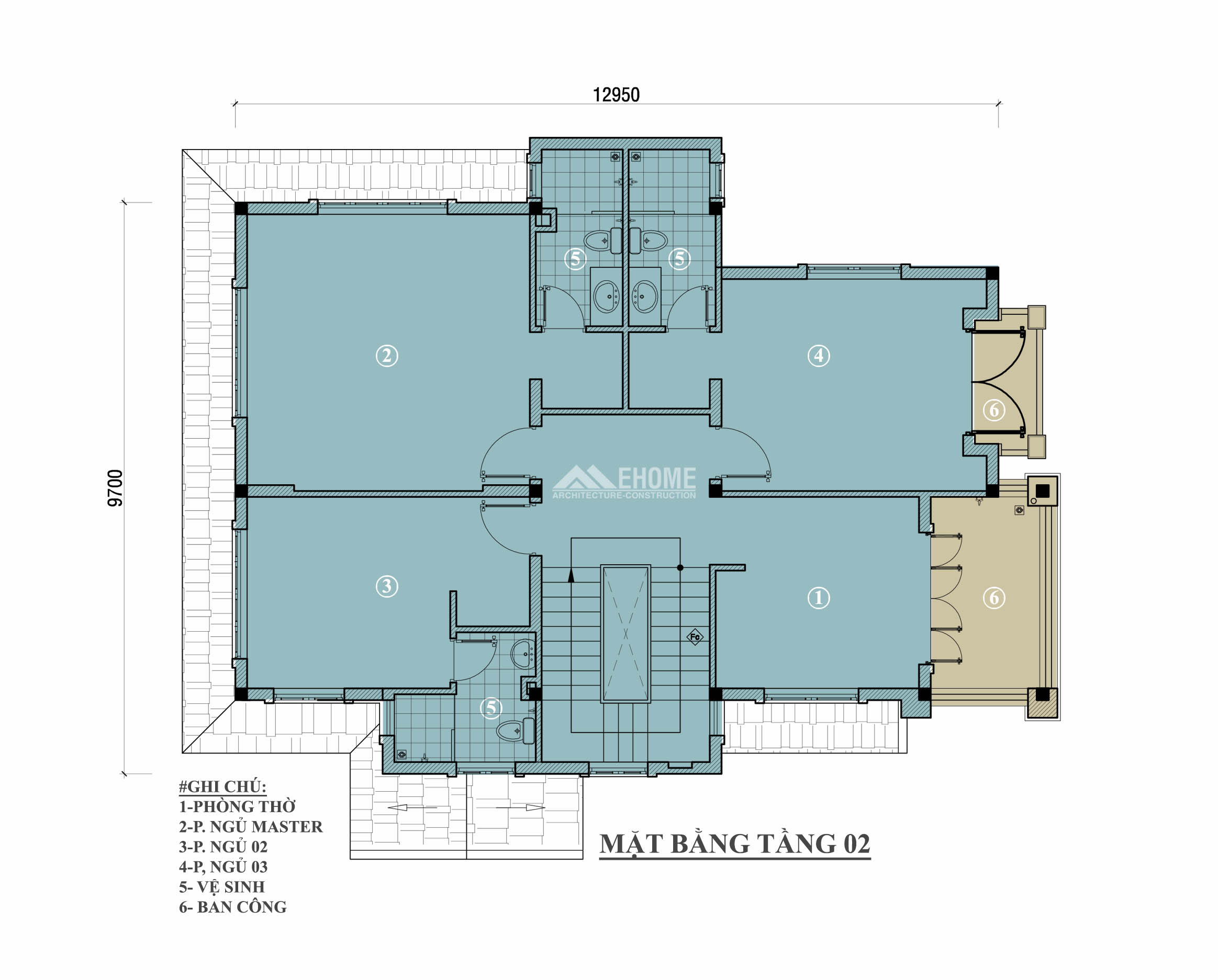 • Mặt Bằng Tầng 2 có Phòng Thờ ở phía trước nhà, 2 phòng ngủ nhỏ và 1 Phòng Ngủ Master.