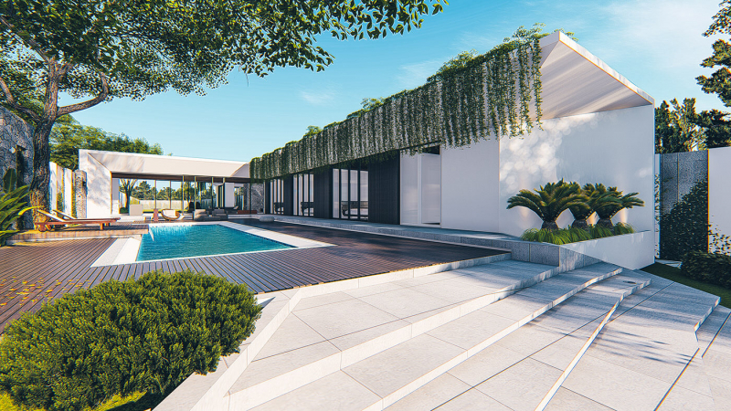 Biệt thự vườn 1 tầng hiện đại được thiết kế hình chữ L, có bể bơi cùng khoảng sân vườn rộng rãi mang đến một không gian sống đậm chất nghỉ dưỡng. Không cần phải đi đâu xa, ngay tại nhà mình, các thành viên có thể tận hưởng bầu không khí trong lành, lắng nghe những thanh âm trong trở của thiên nhiên.