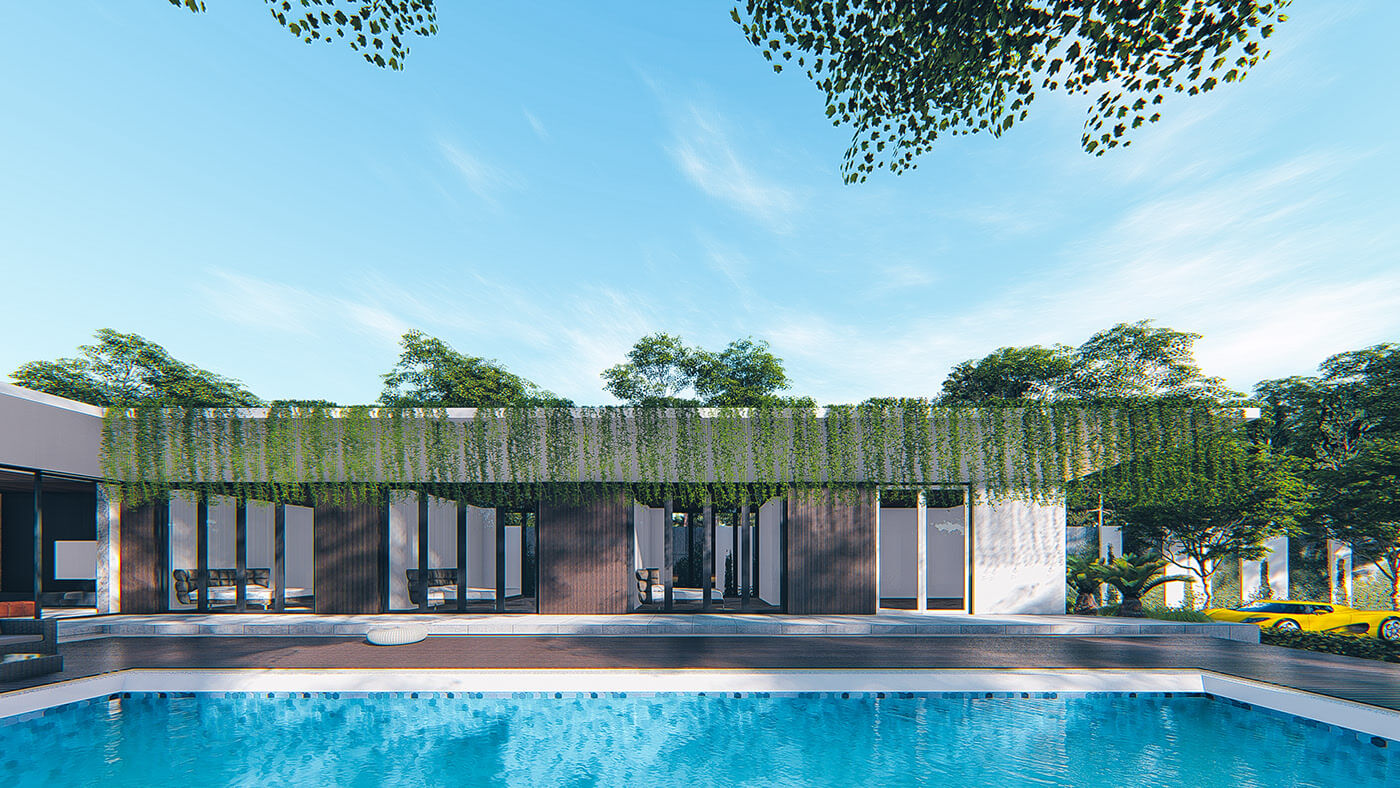 Biệt thự sân vườn thiết kế hồ bơi hình chữ nhật rộng lớn phía trước, ở trên là sàn gỗ và ngôi nhà với thiết kế hình chữ L cùng những cửa kính để các thành viên trong từng gia đình, góc nhìn nào cũng dễ dàng nhìn thấy được.