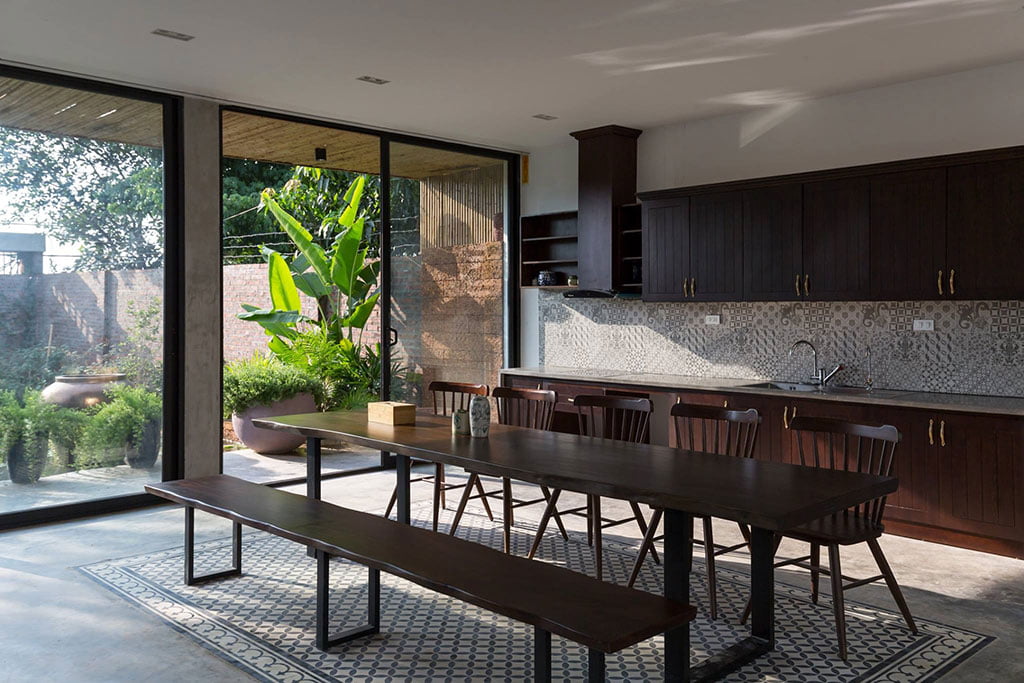 Nội thất với chất liệu gỗ mộc mạc màu nâu đậm mang tính cổ xưa, tủ bếp cũng như bộ bàn ghế ăn được thiết kế theo chiều dài hình chữ nhật nhằm tối ưu không gian, các nội thất được sắp xếp hợp lý đảm bảo sự cân đối, hài hòa trong biệt thự vườn.