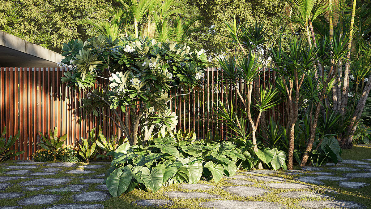 Một khoảng vườn ngập tràn sắc xanh với lối đi được lát đá sạch sẽ trông rất mát mắt.