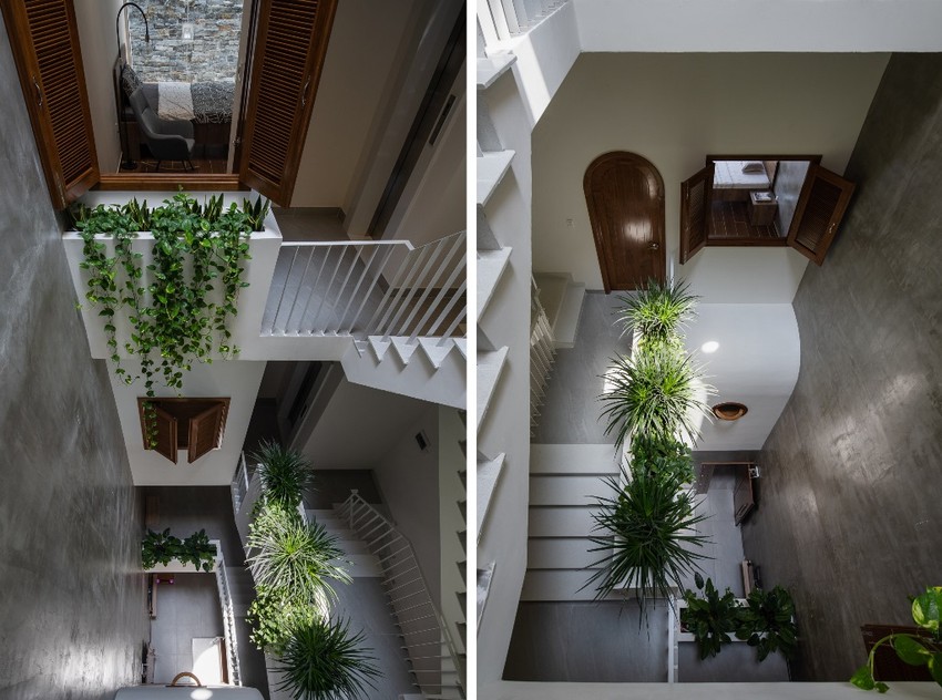 Mở ra không gian sống thoáng đãng: Các sàn trong ngôi nhà được thiết kế so le với nhau tạo ra những ống hút gió xiên giữa các tầng này với tầng khác đảm bảo quá trình lưu thông không khí được dễ dàng và cảm nhận sự thoáng đãng. Mặt khác cầu thang giữa nhà kết hợp với giếng trời giúp từng ngóc ngách luôn ngập tràn ánh sáng.