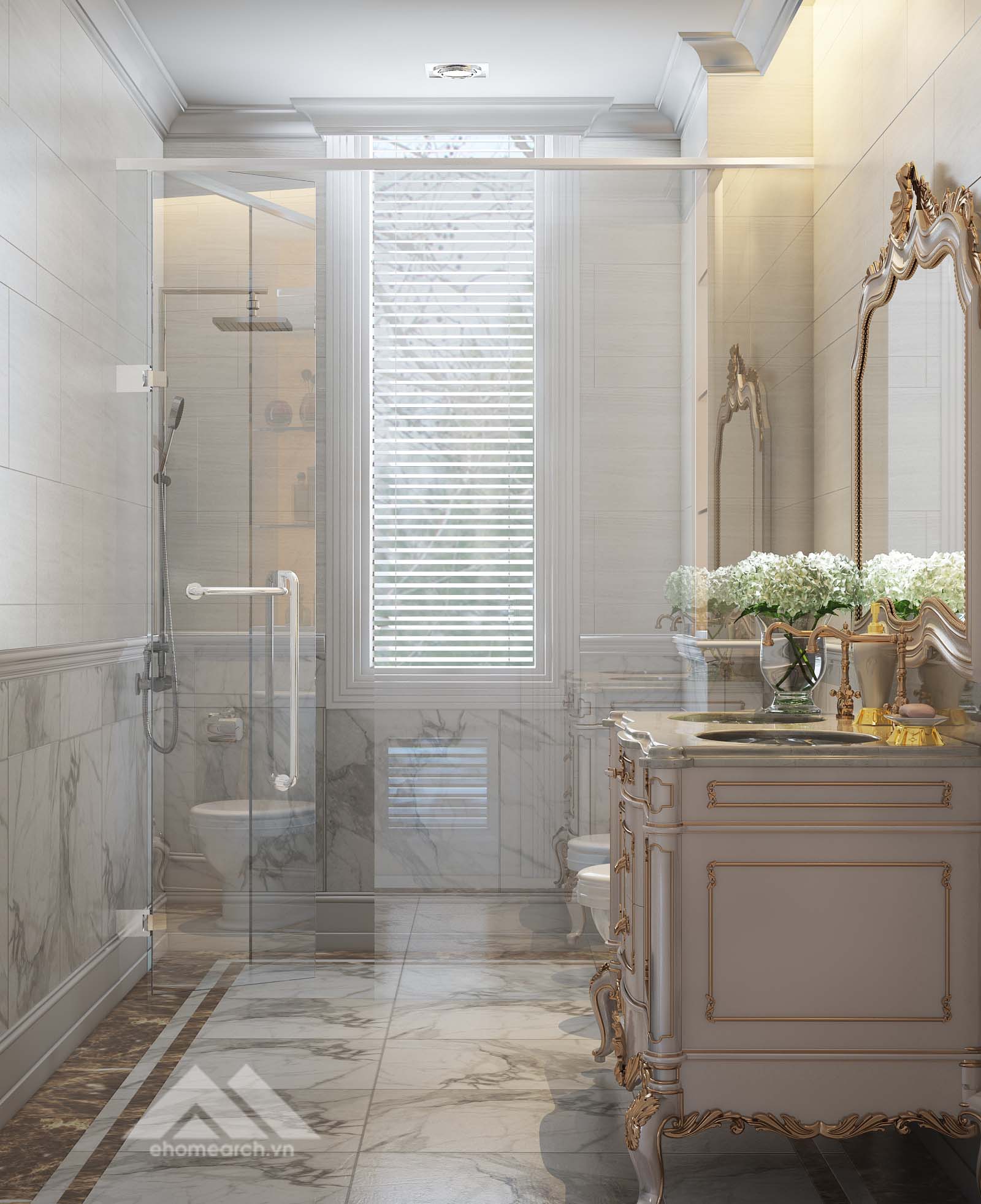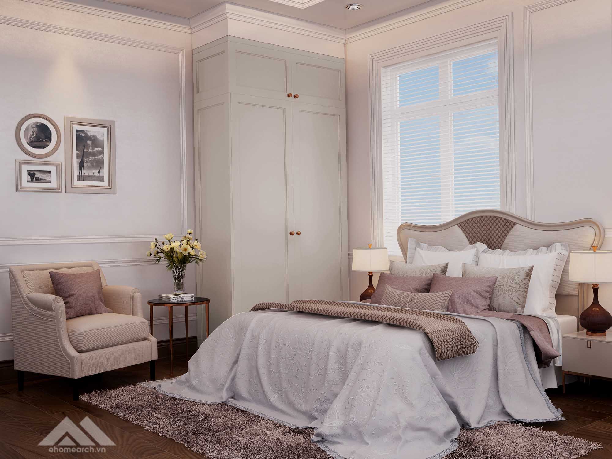 Phong Cách thiết kế: Nhà được thiết kế theo Phong cách Tân Cổ Điển (stile Newclassic), màu chủ đạo là màu Bee hồng nhạt kết hợp với tường có gắn