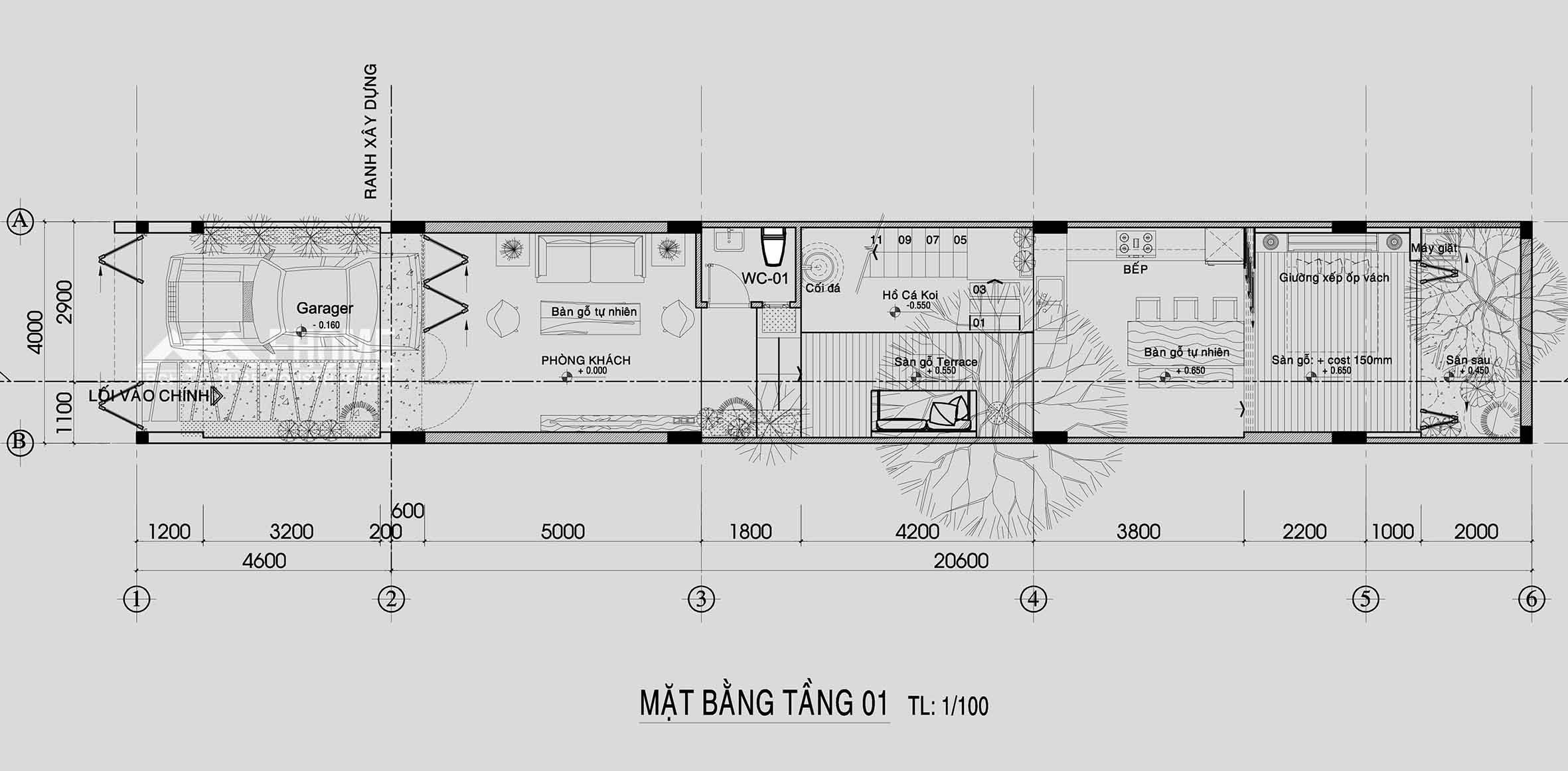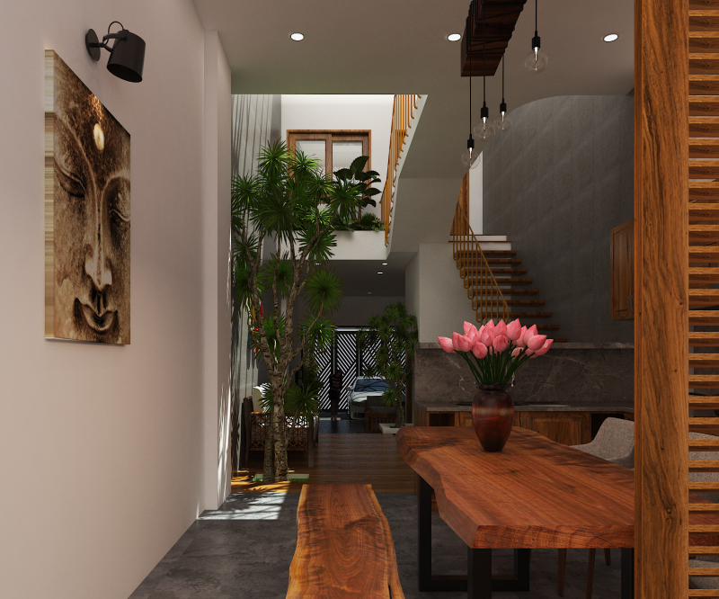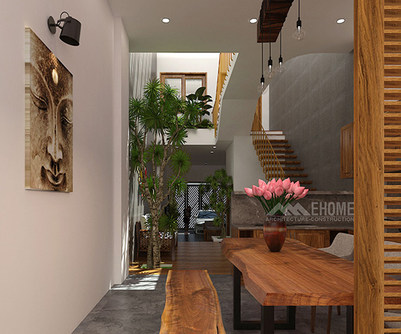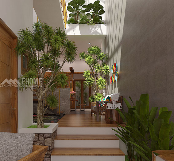 -Mặt bằng nhà phố 4x25m, xây dựng 1 trệt, 1 lầu, 2 phòng ngủ, mài BTCT. Kiến trúc sư Công ty Ehome khi lên thiết kế nội thất nhà phố này đã chừa thông gió ở sân trước 4,6m, giếng trời ở giữa nhà 4,2m, sân sau 2m cách bố trí này làm cho không khí trong nhà lưu thông thoáng khí tự nhiên, bố trí các góc nhỏ trồng cây trong nhà giúp cho chủ nhân có cảm giác như ngôi nhà vườn, mang Resort vào trong nhà phố.