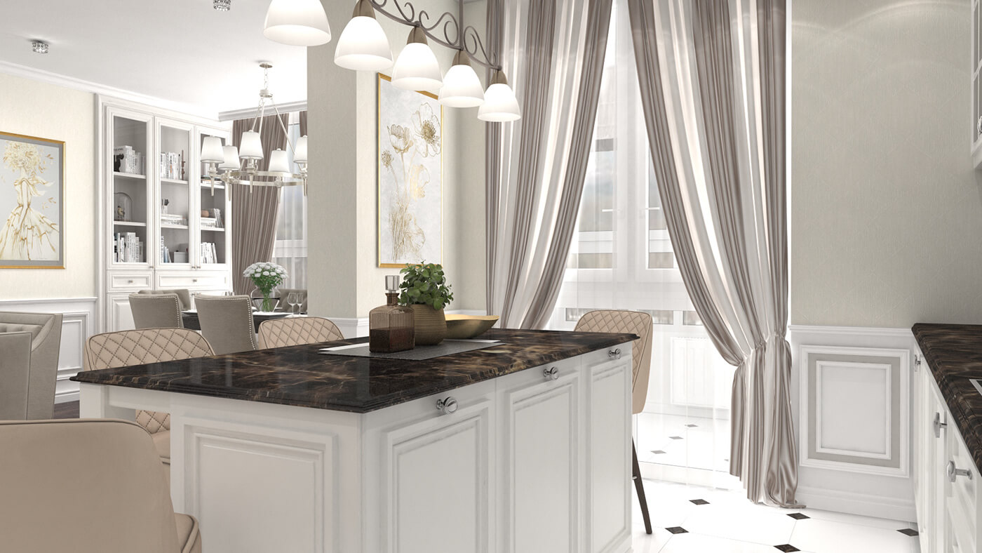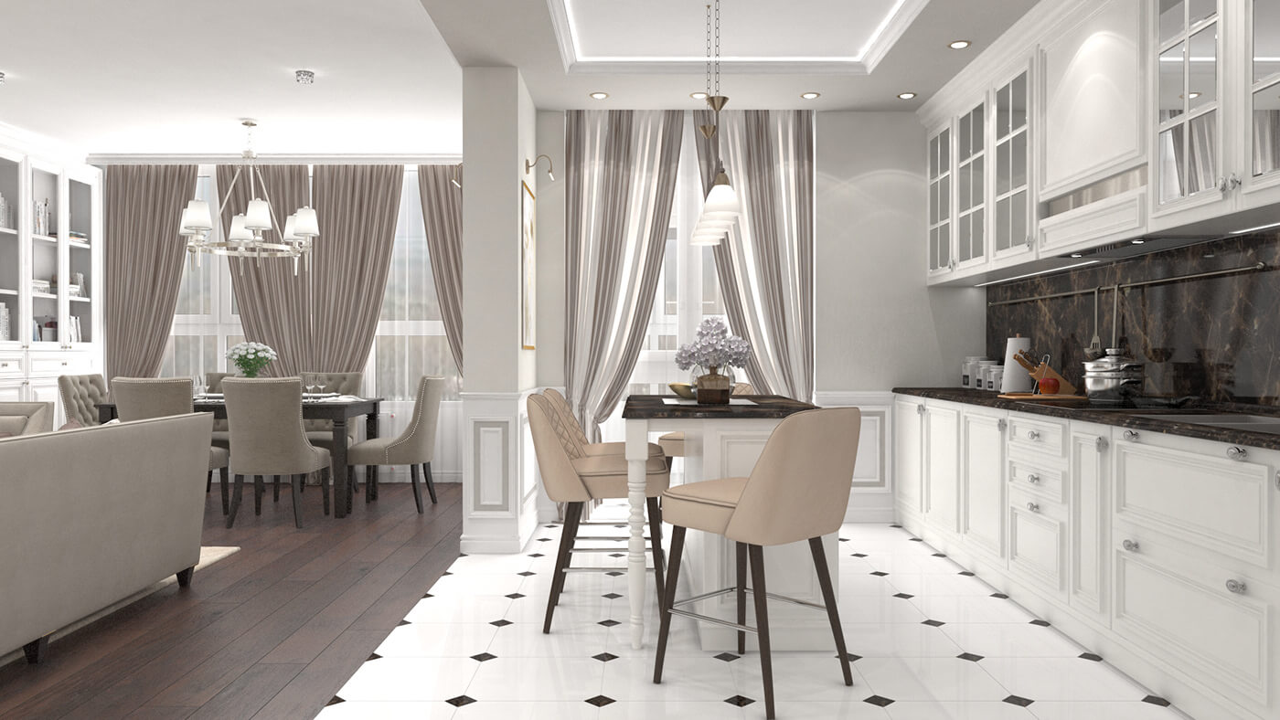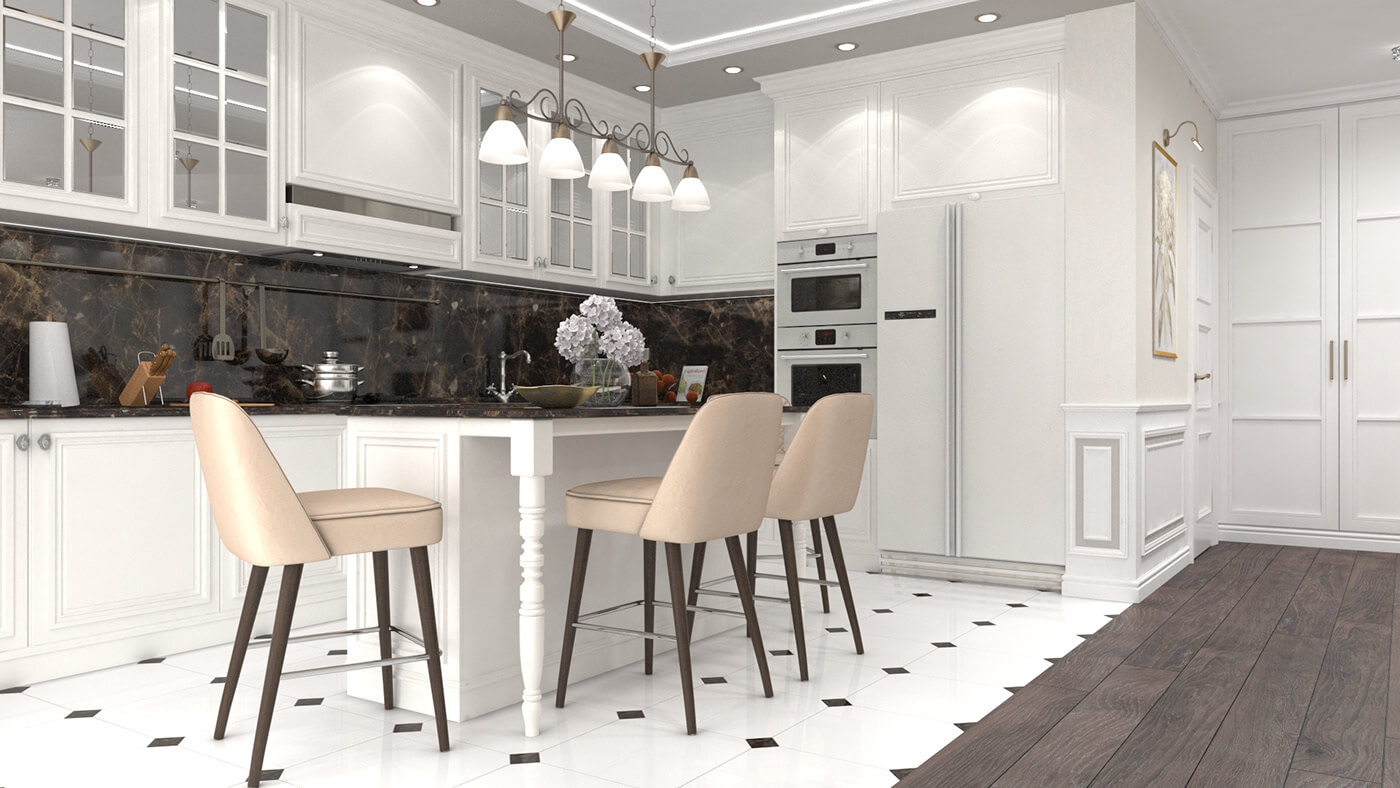 Khu vực bếp thiết kế nội thất chung cư tân cổ điển sang trọng, tiện nghi với tủ bếp hình chữ I được tối ưu không gian hiệu quả màu tủ được làm bằng gỗ tự nhiên sơn trắng sang trọng với những đường gờ vừa đủ để làm điểm nhấn vừa dễ dàng lau chùi.