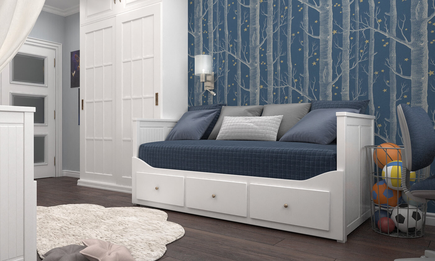 Ngoài không gian để ngủ, thì thiết kế nội thất phòng ngủ của bé cần đến những không gian vui chơi, học tập vì thế phòng ngủ luôn ưu tiên nội thất nhỏ gọn và được sắp xếp thông minh và đảm bảo an toàn trong quá trình hoạt động. Ở phòng ngủ này, màu xanh nhẹ nhàng được chọn làm điểm nhấn tạo nên sự khác biệt trong không gian.