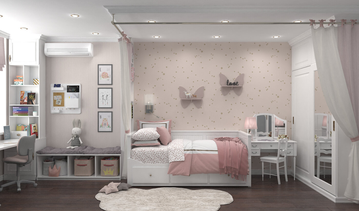 Và mỗi phòng ngủ mang một nét đẹp riêng, nếu như ở phòng trước người nhìn cảm nhận thấy được sự lãng mạn tinh tế thì ở thiết kế nội thất chung cư tân cổ điển này, phòng ngủ của bé sở hữu màu hồng dễ thương, các nội thất nhỏ gọn nhằm tối ưu diện tích mang đến một không gian ngủ nghỉ đầy riêng tư. Các họa tiết, bức tranh trang trí hay những kệ tủ, bàn học sử dụng màu sắc, kích thước phù hợp.