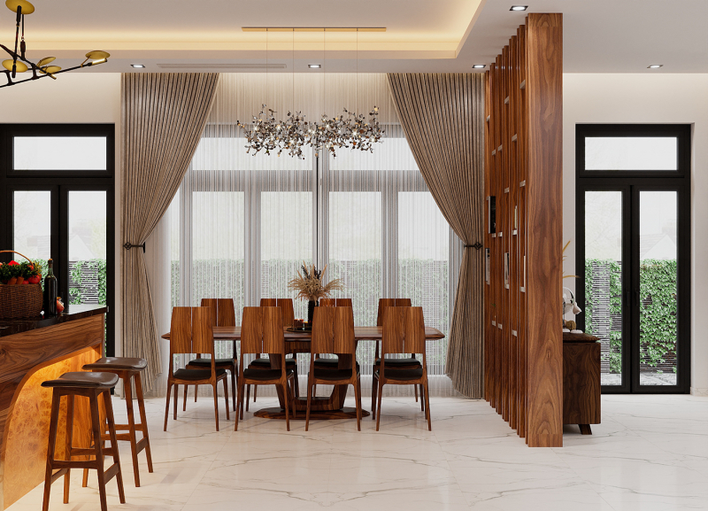 Thiết kế nội thất biệt thự với sự sử dụng chất liệu gỗ óc chó mang đến một không gian sang trọng và tinh tế, kết hợp giữa vẻ đẹp tự nhiên và sự ấm áp của gỗ.