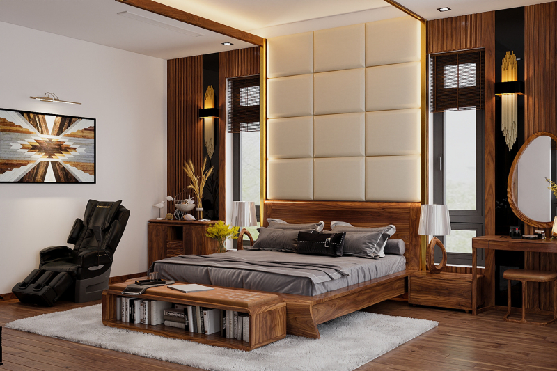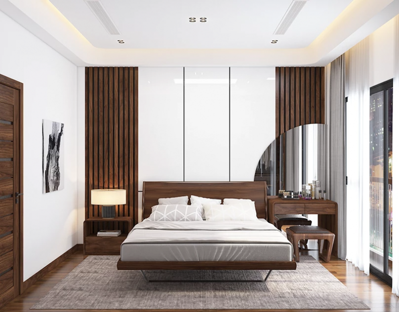 Với màu nâu socola ngọt ngào, ấm áp… gỗ óc chó rất phù hợp trong thiết kế nội thất phòng ngủ. Phong cách hiện đại đơn giản nhưng điểm nhấn nội thất đủ để mang đến vẻ đẹp sang trọng, một không gian nghỉ ngơi tuyệt vời.
