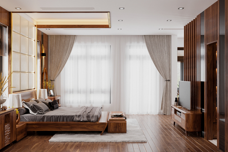 Phòng ngủ chính của biệt thự là không gian của sự riêng tư và nghỉ ngơi. Giường ngủ và các đồ nội thất khác được làm từ gỗ óc chó, tạo nên không gian ấm áp và thư giãn.