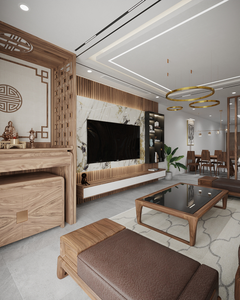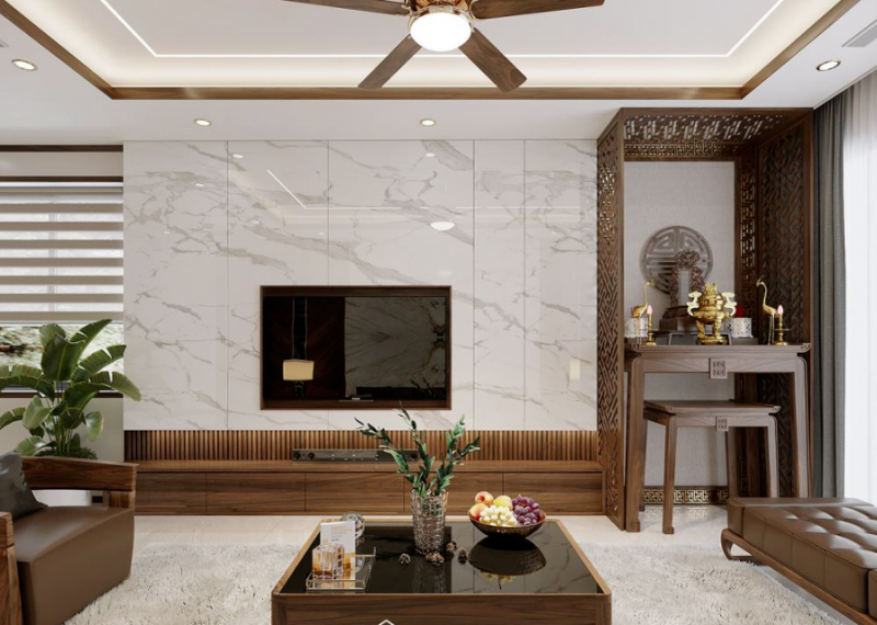 Phòng khách với kệ tivi treo tường nhằm tối ưu diện tích hơn thế kết hợp với phòng thờ mang đến không gian yên tĩnh, thư thái.