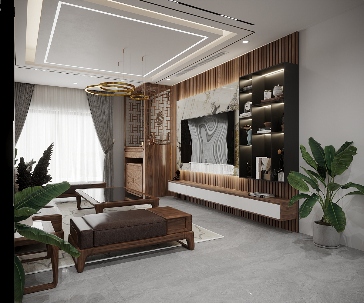 Phòng khách là trung tâm của căn nhà, và thiết kế nhà phố tận dụng gỗ óc chó để tạo nên bộ sofa và bàn trà vô cùng đẳng cấp. Bộ sofa được chế tác tỉ mỉ, với đường nét mềm mại, tạo nên sự thoải mái và sang trọng. Bàn trà là một tác phẩm nghệ thuật riêng, khi chất liệu gỗ óc chó kết hợp với kính.