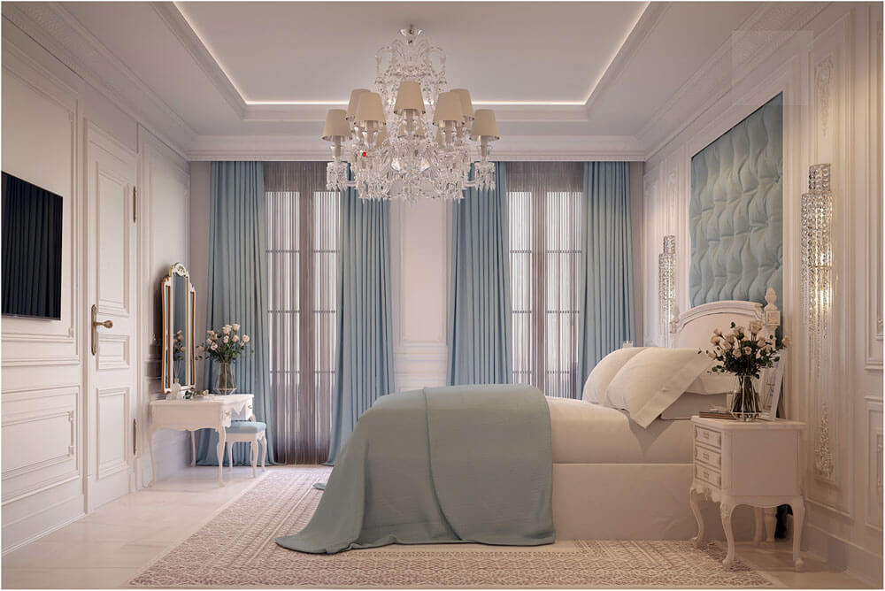 Ví dụng thiết kế nội thất phong cách tân cổ điển bạn có thể chọn một rèm màu trắng họa tiết nhẹ cộng hưởng thêm một rèm tone màu vàng, xanh (màu sắc của rèm có thể hài hòa với sắc màu điểm nhấn) của nội thất phòng ngủ.
